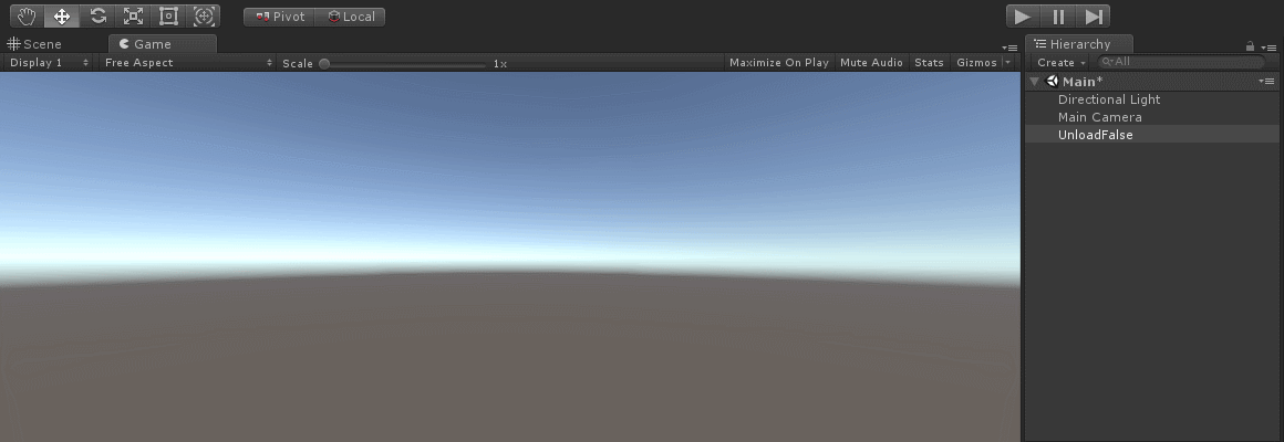 UnloadFalse 스크립트를 빈 게임오브젝트에 추가 후 게임을 플레이합니다.