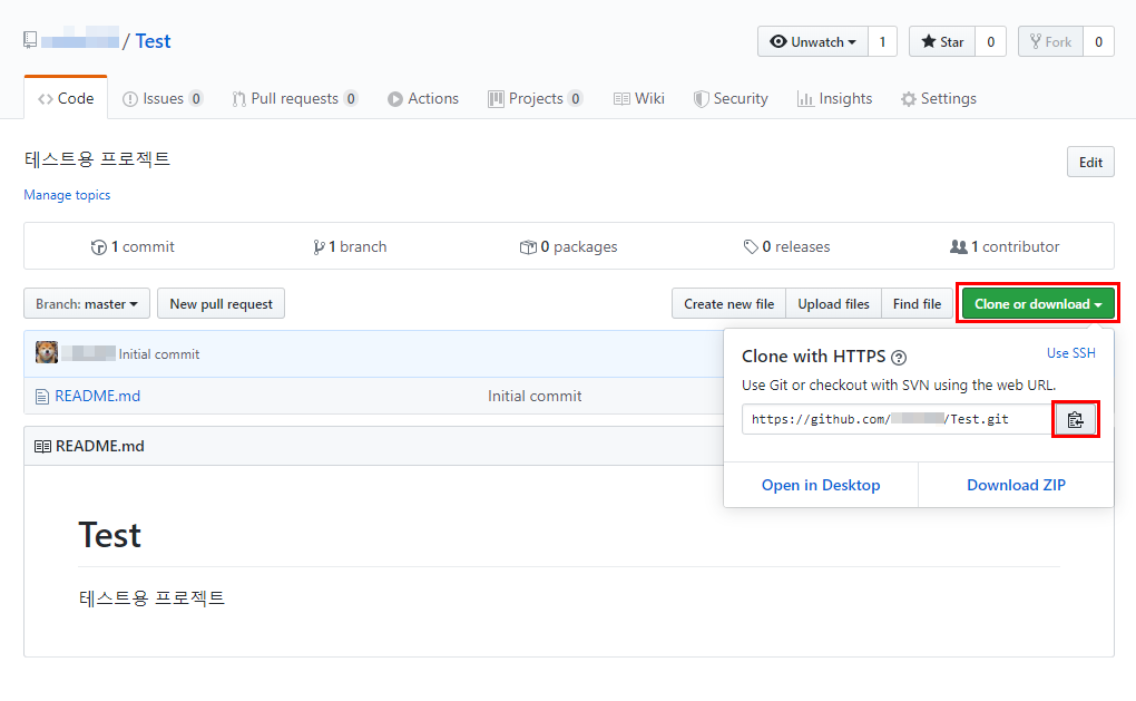 Clone or download를 클릭한 후 Test 저장소의 주소를 복사해 둡니다.