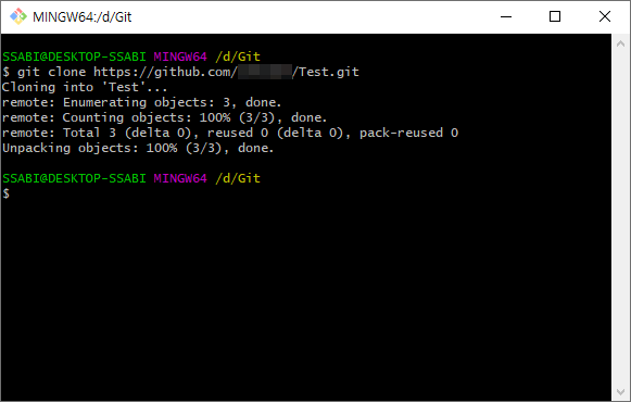 폴더를 확인해 보면 깃허브에서 생성한 Test 저장소가 로컬저장소에 복제되었습니다.