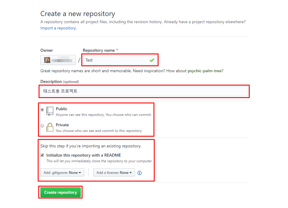 저장소 이름(Repository name)을 입력하고 설명(Description)을 입력합니다.