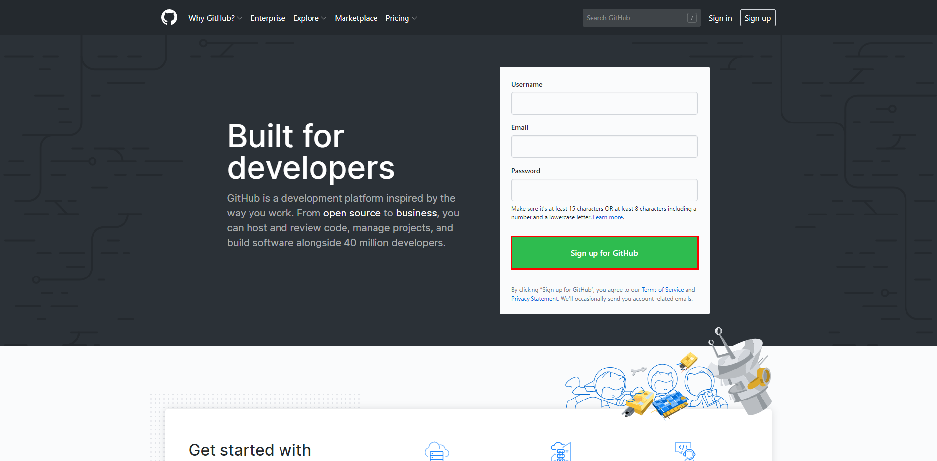 깃허브를 사용하기 위해서는 회원가입을 해야합니다. 깃허브 사이트에서 Sign up for Github를 클릭해서 회원가입을 합니다.